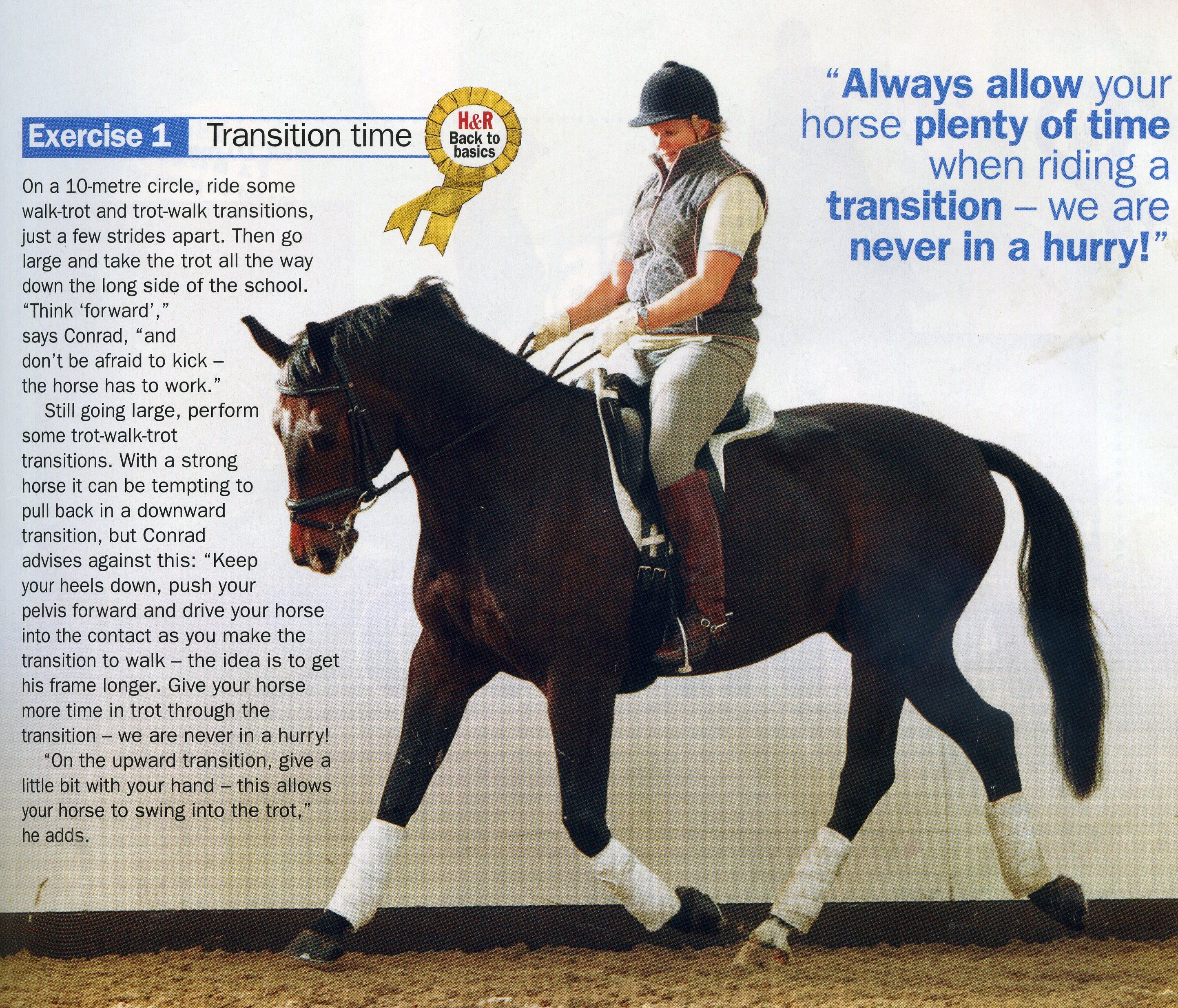 "It is ail-too easy to perform both upward and downward transitions incorrectly," says Conrad. "You can pull the horse back, push him onto the forehand, push him outwards - but nothing will actually be happening." To get your horse responsive to your aids and more 'through' in the transitions, try this exercise...