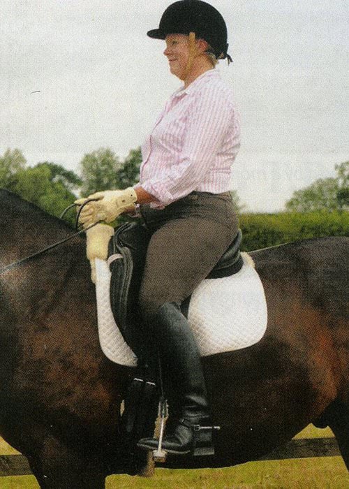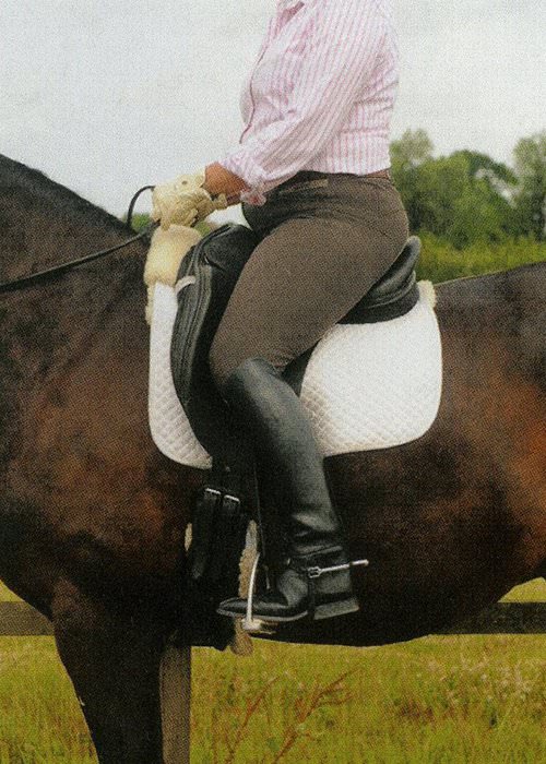 Tip When bringing more weight into the saddle it needs to be in a good way for the horse. The rider must not lean back so that he is behind the vertical as this is not comfortable for the horse's back. The rider should think about lowering his heels bringing a little more weight in to the saddle and the legs should lie quietly on the horse's side.