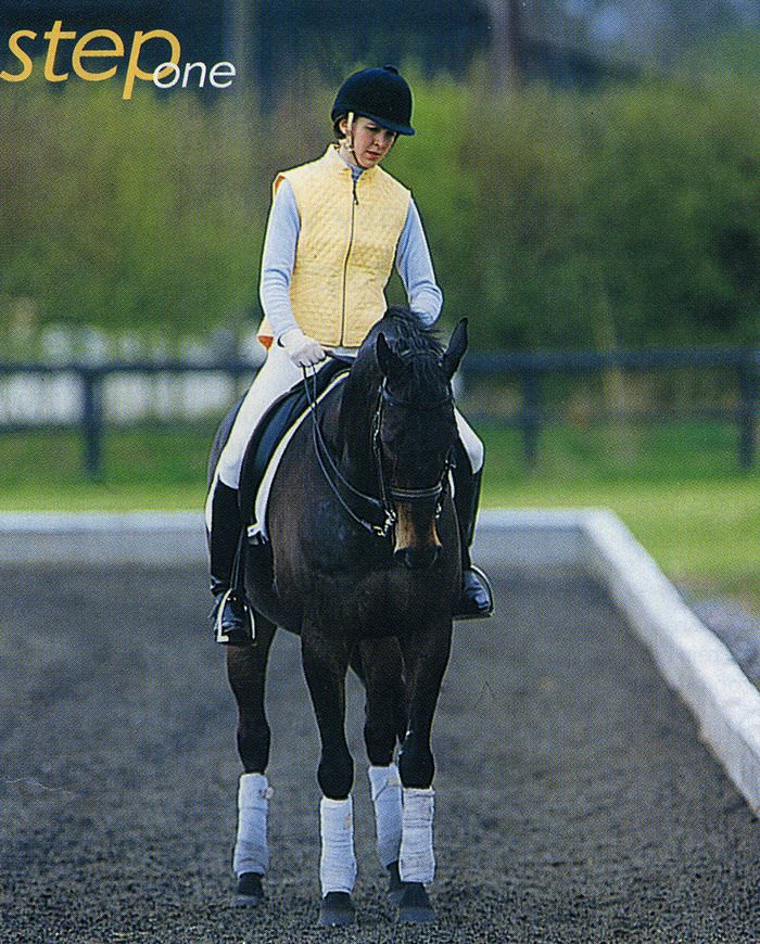 Use your left leg just behind the girth and push the hindleg, step by step, around the forehand until the turn is complete. It's easy to tilt your body and collapse to one side (see step four), so try to sit up.