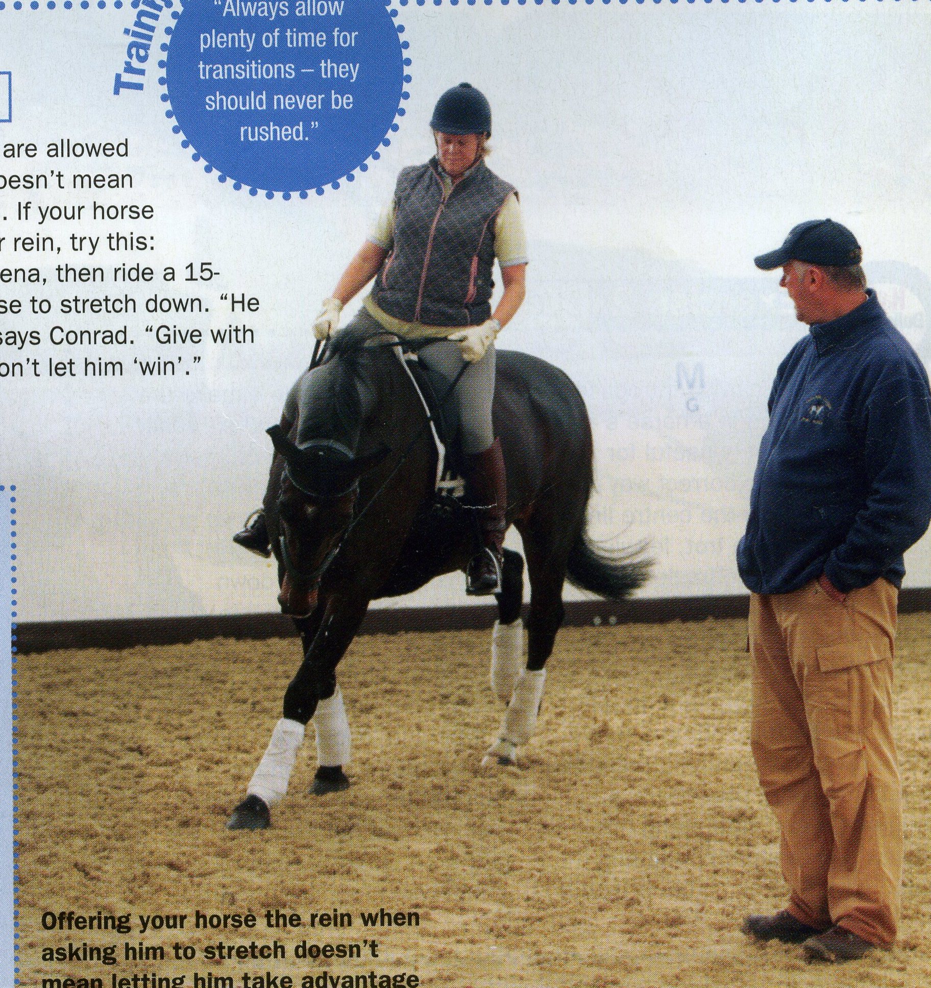 "It is ail-too easy to perform both upward and downward transitions incorrectly," says Conrad. "You can pull the horse back, push him onto the forehand, push him outwards - but nothing will actually be happening." To get your horse responsive to your aids and more 'through' in the transitions, try this exercise...