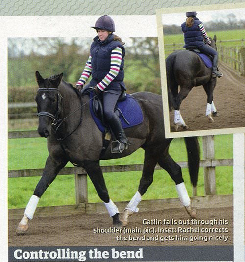 Rachel finds this work difficult, and so does Gatlin. As soon as she gives an aid with the right rein he slows. She has to be brave and ride him forwards. "He isn't being difficult, he just doesn't understand. You need to be clear - he needs to understand that he has to react to the aid on the inside rein and look in that direction."