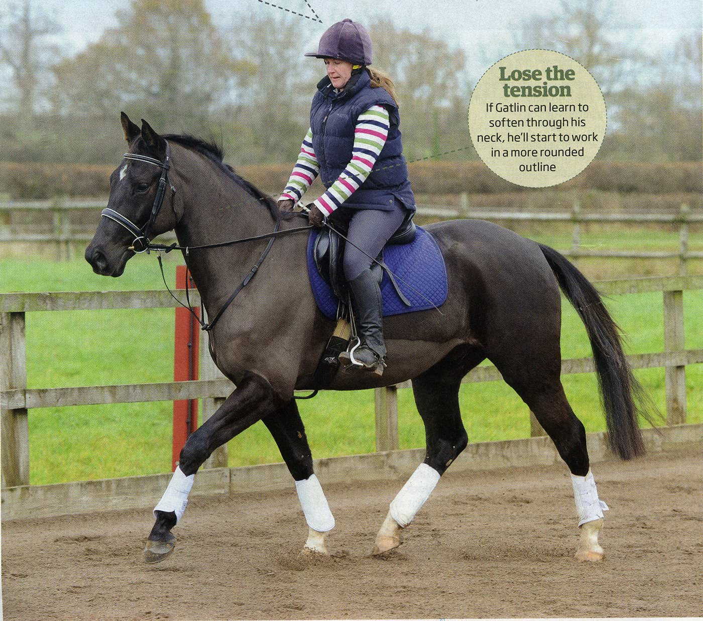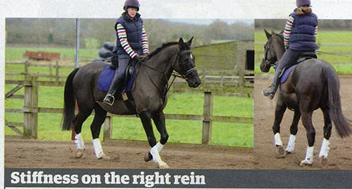 "I've owned Gatlin, a six-year-old Trakehner gelding, for two years. He's done very little so far - a few showjumping clear rounds, cross-country schooling and hacking - but my plan is to eventually do some affiliated eventing. Gatlin is generally laid back, but he can also be quite sharp, which I find difficult to deal with. He has nice paces but feels very fixed in the contact and I find it difficult to get him to flex - especially on the right rein."