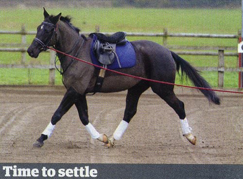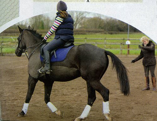 "Don't forget he must go forwards - he finds it difficult this way but he needs to maintain a good working trot and keep turning to the right. Once he's bending nicely to the right let him have a stretch."