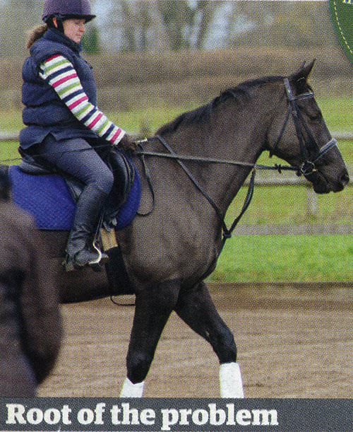 As Rachel walks around the arena Amanda comments on what a lovely walk Gatlin has. "It's an active walk with a good over-track. The problem you have is that Gatlin's fixed in his neck position and you look as though you're holding on to him." Amanda explains that while he's carrying his neck in this way Gatlin can't work over his back correctly and he'll find it difficult to go forwards. This is why it's such a problem when he spooks - he's so tense it's difficult for Rachel to control him. Rachel needs to alter the position of Gatlin's neck so he becomes softer and rounder. "Once he's more supple in his neck you'll find schooling and riding him much easier," explains Amanda.