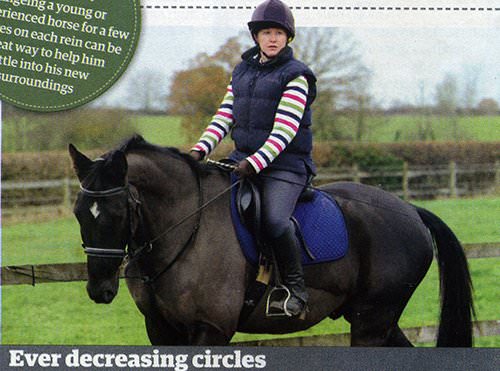 "Straightening him slightly with your outside rein and using your outside leg, too, will help to keep him on the correct sized circle."