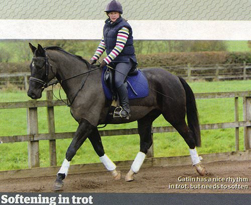 "Keep your elbows elastic, as this gives him nothing to sit on," says Amanda. "Make sure your reins don't get too long. If your hands are back near your tummy you're pulling against him." Gatlin begins to go in a softer shape.