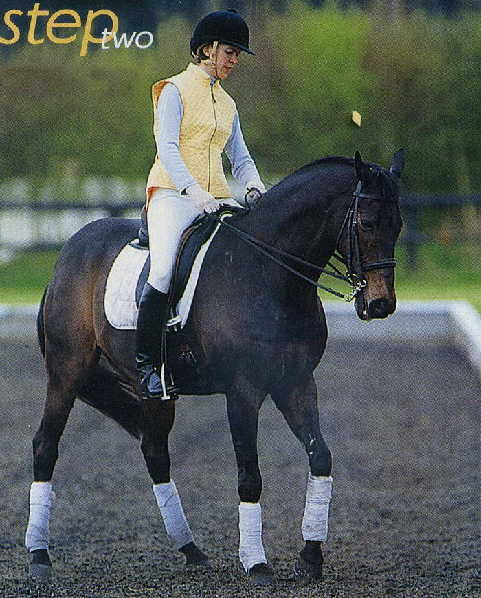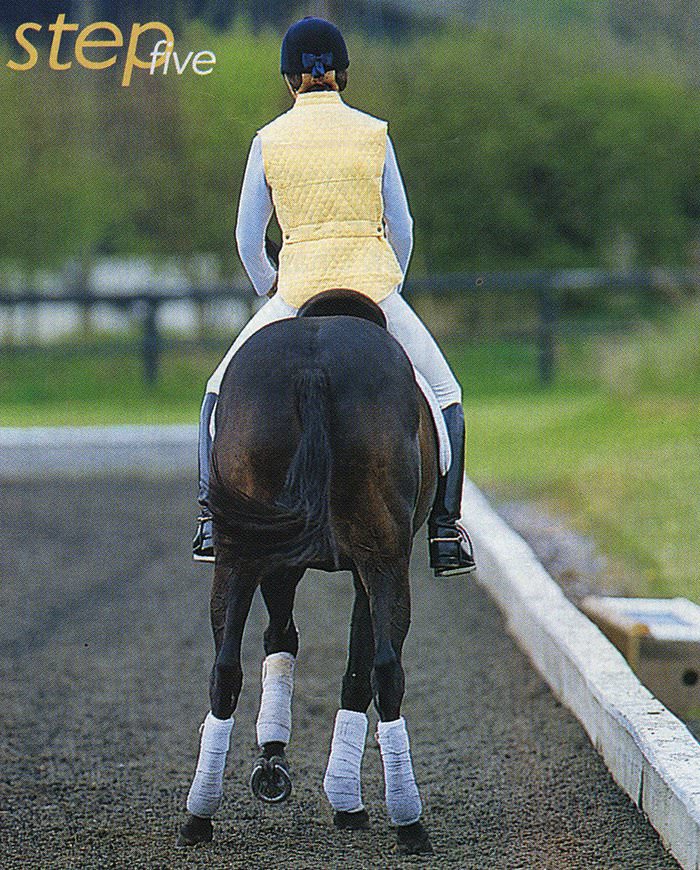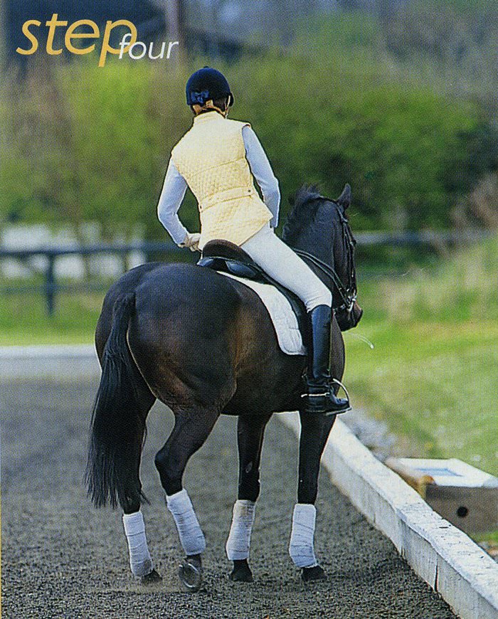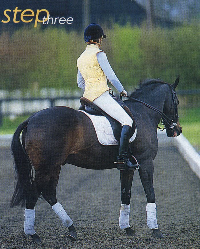 Use your left leg just behind the girth and push the hindleg, step by step, around the forehand until the turn is complete. It's easy to tilt your body and collapse to one side (see step four), so try to sit up.