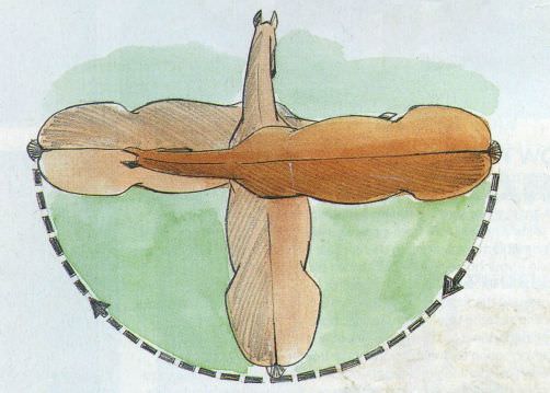 In turn on the forehand, the horse turns on the spot with his hindlegs moving around his forehand. The idea is to complete a 180°° turn and you should end up facing in the opposite direction. Your horse should pivot around the inside foreleg which should mark time (picked up and returned to the same spot, or near it), not be screwed into the ground! The outside foreleg moves very slightly forward and the hindlegs move in an arc around the forehand - the inside hindleg crosses in front of the outside hindleg. In order to do this, the horse has to raise and arch his back to enable him to lift and cross the inside hindleg. During the turn, do not allow your horse to fall sideways or run back or forwards.